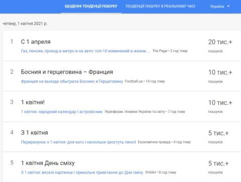 Сьогодні, 1 квітня, українці найбільше шукали у пошуковику Google інформацію про те, що цього дня у світі відзначаються День сміху, День розчинної кави, День народження долара, Міжнародний день веселощів на роботі, Міжнародний день птахів, Міжнародний день ремонту доріг, День викопних дурнів, День їстівної книги, Міжнародний день фріволіте.