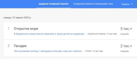 Сьогодні, 10 червня, українці найбільше шукали у пошуковику Google інформацію про те, що ще 8 червня у місті Бердянськ Запорізької області в районі пляжу "Малібу" під час купання на гумовому матраці 4 місцевих мешканців віднесло у відкрите море, з низ троє – діти 10, 13 і 15 років.