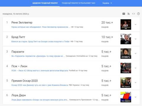 Сьогодні, 10 лютого, українці найбільше шукали у пошуковику Google інформацію про те, що зірка Голлівуду Рене Зеллвегер отримала премію Оскар у номінації Краща актриса за роль у стрічці Джуді. 92-га церемонія нагородження відбулася 9 лютого в американському Лос-Анджелесі.
