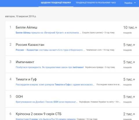 Сьогодні, 10 вересня, українці найбільше шукали у пошуковику Google інформацію, що цього дня Верховна Рада схвалила закон про імпічмент президентові, автором якого є президент Володимир Зеленський.