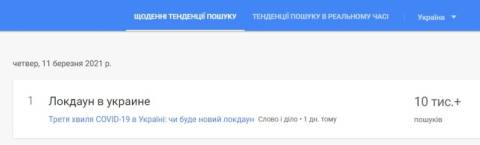 Сьогодні, 11 березня, українці найбільше шукали у пошуковику Google інформацію про те, що прем'єр-міністр Денис Шмигаль ще 4 березня заявив, що в Україні розпочалася третя хвиля епідемії коронавірусу. Наприкінці лютого – початку березня добовий приріст хворих зріс до 8-10 тисяч, після чого в країні знову заговорили про оголошення локдауну.