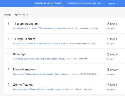 Сьогодні, 11 червня, українці найбільше шукали у пошуковику Google інформацію про те, що цього дня народний депутат від партії Голос Святослав Вакарчук оголосив про складання мандата.