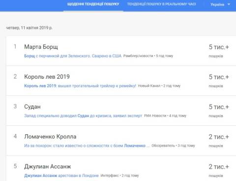 Сьогодні, 11 квітня, українці найбільше шукали у пошуковику Google інформацію, що кандидату президенти Володимир Зеленський в разі обрання президентом планує запросити Велику Британію та США до участі в переговорах у нормандському форматі, а Віктора Медведчука позбавити ролі посередника в переговорах із Росією.