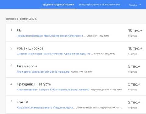 Сьогодні, 11 серпня, українці найбільше шукали у пошуковику Google інформацію про те, що у матчі 1/4 фіналу Ліги Європи англійський Манчестер Юнайтед переміг данський Копенгаген з рахунком 1:0.