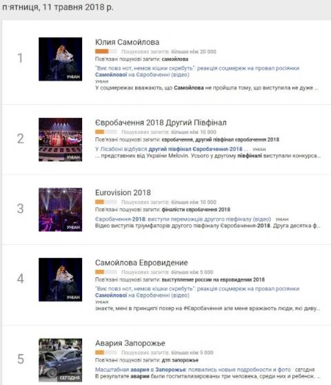 Сьогодні, 11 травня, українці найбільше шукали у пошуковику Google інформацію, що вчора у Лісабоні (Португалія) відбувся другий півфінал міжнародного пісенного конкурсу Євробачення-2018.