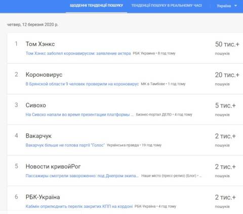 Сьогодні, 12 березня, українці найбільше шукали у пошуковику Google інформацію про те, що Всесвітня організація охорони здоров'я оголосила пандемію у зв'язку з поширенням у світі коронавірусу, а американський актор Том Хенкс заразився коронавірусом.