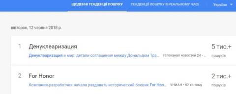 Сьогодні, 12 червня, українці найбільше шукали у пошуковику Google інформацію, що цього дня президент США Дональд Трамп та лідер КНДР Кім Чен Ин підписали угоду, яка полягає у встановлення мирних відносин, звільнення полонених та спільній роботі над денуклеаризацією півострова.