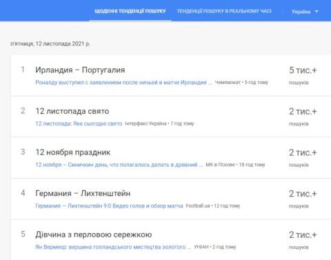 Сьогодні, 12 листопада, українці найбільше шукали у пошуковику Google інформацію про те, що вчора відбувся матч відбору на Чемпіонат Світу-2022 у групі А між збірними Ірландії та Португалії.
