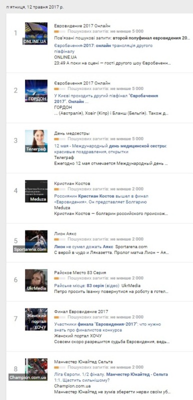 Сьогодні, 12 травня, українці найбільше шукали у пошуковику Google інформацію про те, що вчора у Києві пройшов другий півфінал пісенного конкурсу "Євробачення 2017".
