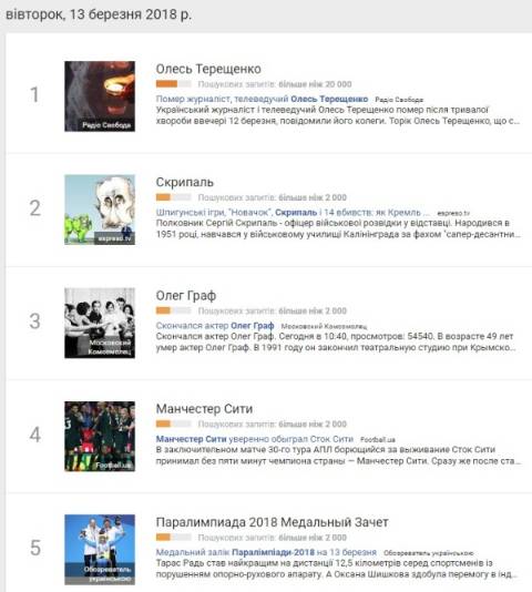 Сьогодні, 13 березня, українці найбільше шукали у пошуковику Google інформацію, що вчора ввечері у віці 43 роки помер після тривалої хвороби український журналіст і телеведучий Олесь Терещенко.