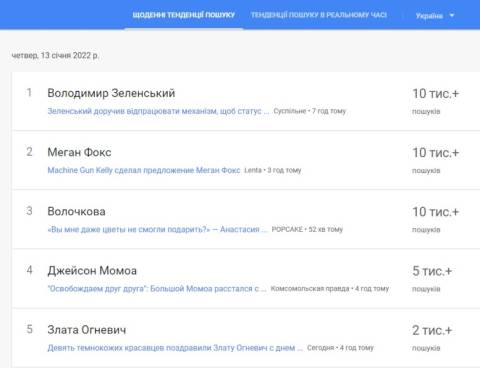 Сьогодні, 13 січня, українці найбільше шукали у пошуковику Google інформацію про те, що президент Володимир Зеленський на останньому засіданні РНБО 30 грудня 2021 року доручив відпрацювати механізм взаємодії з міжнародними та іноземними партнерами, щоб статус олігарха та пов'язані з ним обмеження не залишалися виключно в межах країни.