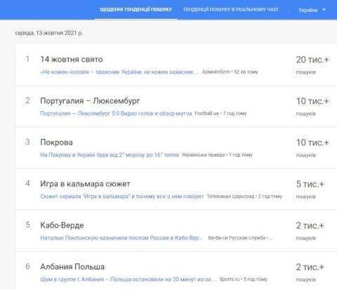 Сьогодні, 13 жовтня, українці найбільше шукали у пошуковику Google інформацію про те, що завтра, 14 жовтня, в Україні відзначають День захисників і захисниць України, День Українського козацтва та свято Покрови Пресвятої Богородиці.