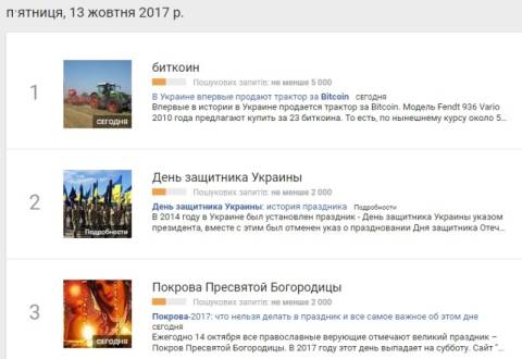 Сьогодні, 13 жовтня, українці найбільше шукали у пошуковику Google інформацію, що вперше в історії в Україні за електронну валюту Bitcoin продається трактор. Модель Fendt 936 Vario 2010 пропонують купити за 23 біткоїни, що за сьогоднішнім курсом становить майже 12 тисяч гривень.