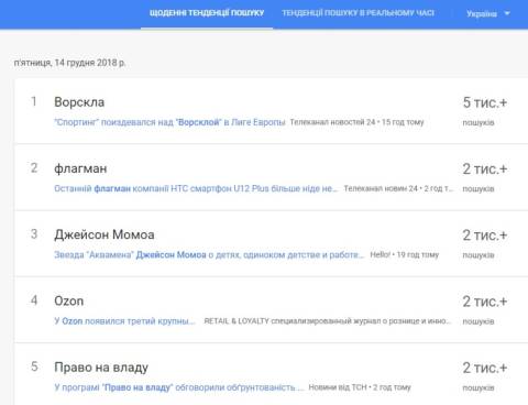 Сьогодні, 14 грудня, українці найбільше шукали у пошуковику Google інформацію, що полтавський футбольний клуб "Ворскла" програв матч Ліги Європи з ФК "Спортінгом" (Потругалія), який відбувся у Лісабоні.
