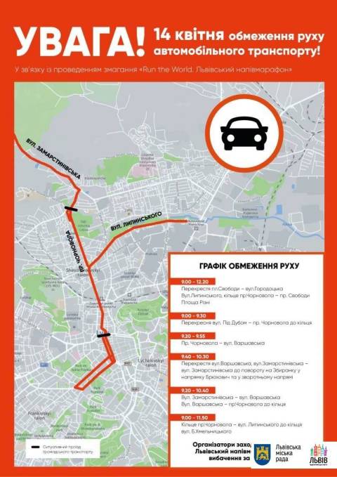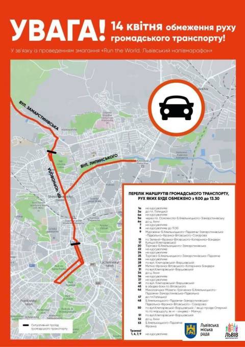 В неділю, 14 квітня, у Львові відбудеться "Run the World. Львівський напівмарафон". Для гарантування безпеки учасникам забігу буде частково змінено рух громадського транспорту у місті.