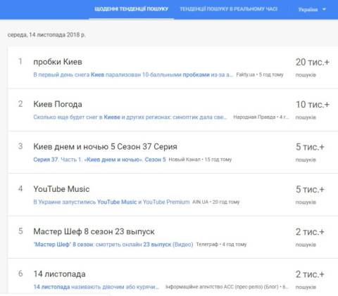 Сьогодні, 14 листопада, українці найбільше шукали у пошуковику Google інформацію, що у Києві випав перший сніг. Завтра у столиці також продовжиться снігопад.