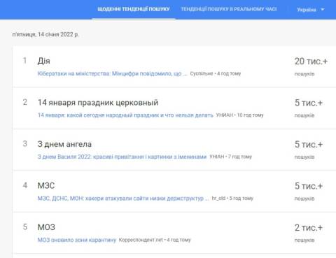 Сьогодні, 14 січня, українці найбільше шукали у пошуковику Google інформацію про те, що, як повідомили у Міністерстві цифрової трансформації, попри хакерські атаки на урядові сайти мобільний застосунок "Дія" працює в штатному режимі.