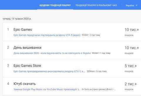 Сьогодні, 14 травня, українці найбільше шукали у пошуковику Google інформацію про те, що в магазині цифрової дистрибуції Epic Games Store розпочалася роздача безкоштовної гри – GTA 5.