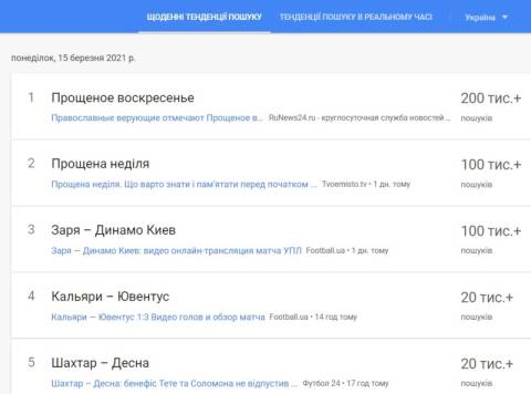 Сьогодні, 15 березня, українці найбільше шукали у пошуковику Google інформацію про те, що вчора, 14 березня була остання неділя перед Великим постом, що триватиме від 15 березня до 2 травня.