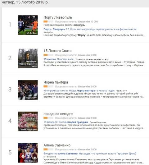 Окрім цього, зацікавила українців новина про те, що у 1/8 фіналу Ліги чемпіонів з футболу відбувся матч між командами "Порту" (Португалія) та "Ліверпуль" (Англія). Перемогли англійці з рахунком 0:5.