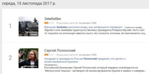 Сьогодні, 15 листопада, українці найбільше шукали у пошуковику Google інформацію, що збройні сили, які захопили владу в Зімбабве, заявили, що зробили це, щоб запобігти конфлікту в країні.