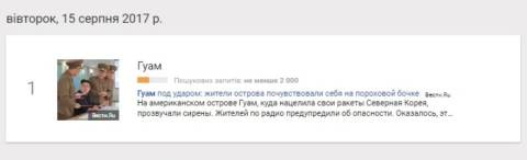 Сьогодні, 15 серпня, українці найбільше шукали у пошуковику Google інформацію, що адміністрація американського острова Гуам опублікувала керівництво для підготовки місцевих жителів у разі потенційної ядерної атаки з боку КНДР.