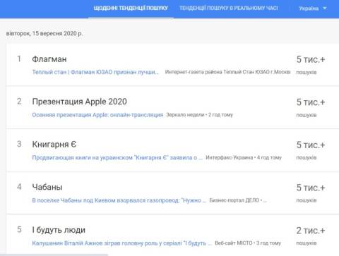 Сьогодні, 15 вересня, українці найбільше шукали у пошуковику Google інформацію про те, що у вівторок о 20:00 за київським часом компанія Apple проведе свою традиційну осінню презентацію. Зазвичай у вересні компанія показує нові iPhone, але цього року, ймовірно, цього не станеться. За даними Bloomberg, новий смартфон представлять не раніше жовтня.