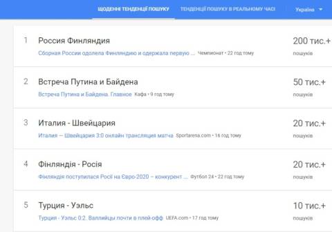 Сьогодні, 17 червня, українці найбільше шукали у пошуковику Google інформацію про те, що у другому турі чемпіонату Європи Фінляндія поступилася Росії.