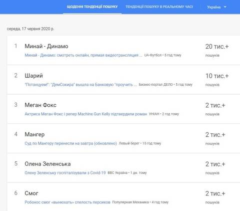 Сьогодні, 17 червня, українці найбільше шукали у пошуковику Google інформацію про те, що цього дня о 14:00 год відбувся перший півфінальний матч Кубка України з футболу, в якому зустрілися команди Минай і Динамо. Команди грали на стадіоні Минай.