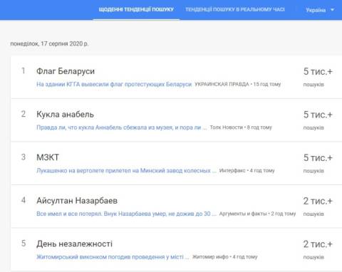 Сьогодні, 17 серпня, українці найбільше шукали у пошуковику Google інформацію про те, що вчора над входом до будівлі Київської міської державної адміністрації вивісили національний біло-червоно-білий прапор Білорусі, який використовується протестувальниками.