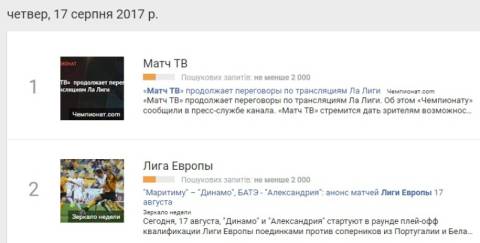Сьогодні, 17 серпня, українці найбільше шукали у пошуковику Google інформацію, що українські футбольні команди продовжать боротьбу за вихід у груповий етап Ліги Європи.