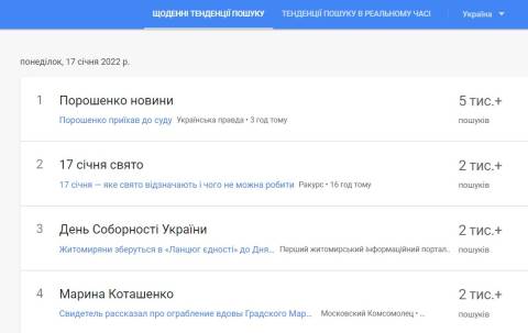 Сьогодні, 17 січня, українці найбільше шукали у пошуковику Google інформацію про те, що народний депутат від Європейської Солдарності, п'ятий президент України Петро Порошенко прилетів в Україну.