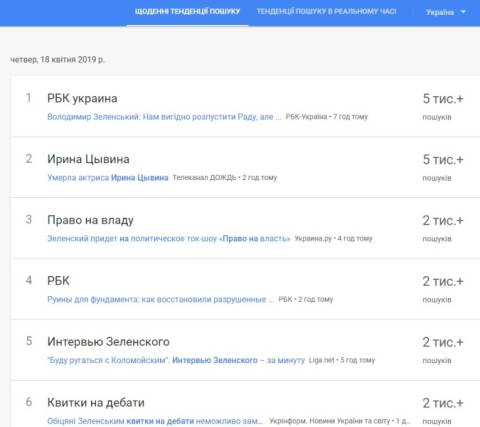 Сьогодні, 18 квітня, українці найбільше шукали у пошуковику Google інформацію, що кандидат у президенти Володимир Зеленський в інтерв'ю розповів про своє ставлення до заборони в'їзду російським артистам, закону про мову і мовні квоти на телебаченні і радіо, можливий розпуск парламенту, готовність до політичних союзів, ставлення до Володимира Путіна і своє бачення народовладдя у країні.