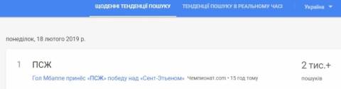 Сьогодні, 18 лютого, українці найбільше шукали у пошуковику Google інформацію, що у матчі 25-го туру Ліги 1 чемпіонату Франції з футболу ПСЖ на виїзді вистачило одного гола для перемоги над Сент-Етьєном.