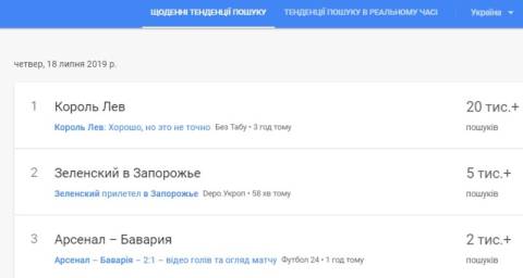 Сьогодні, 18 липня, українці найбільше шукали у пошуковику Google інформацію, що цього дня в український прокат виходить перезапуск класичного мультфільму Disney "Король лев".