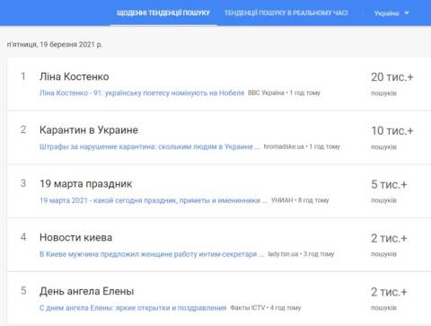 Сьогодні, 19 березня, українці найбільше шукали у пошуковику Google інформацію про те, що цього дня легендарній українській письменниці та поетесі Ліні Костенко виповнився 91 рік. Ліна Костенко є моральним авторитетом для багатьох українців, її називають "совістю нації".