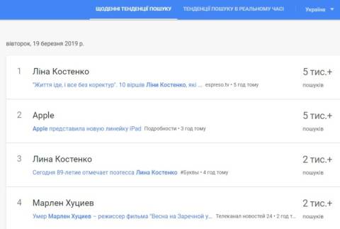 Сьогодні, 19 березня, українці найбільше шукали у пошуковику Google інформацію, що цього дня одній із найвідоміших українських письменниць сучасності Ліні Костенко виповнюється 89 років.