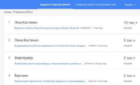 Сьогодні, 19 березня, українці найбільше шукали у пошуковику Google інформацію про те, що цього дня святкує свій 90-й день народження одна із найвідоміших українських письменниць сучасності Ліна Костенко.