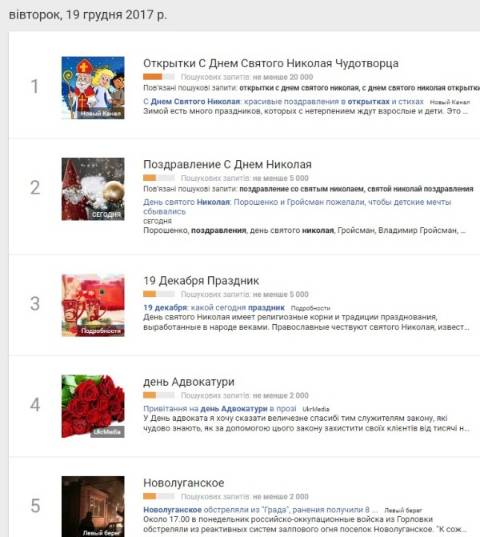 Сьогодні, 19 грудня, українці найбільше шукали у пошуковику Googe інформацію, що в Україні відзначають День святого Миколая – покровителя дітей, з якого починається низка новорічних свят.