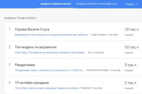 Сьогодні, 19 жовтня, українці найбільше шукали у пошуковику Google інформацію про те, що Дарницький райсуд Києва зобов'язав автора книги "Справа Василя Стуса" Вахтанга Кіпіані та видавництво Vivat видалити з неї інформацію про Віктора Медведчука, голову партії "Опозиційна платформа – За життя", який був адвокатом Стуса, та заборонити розповсюдження накладу книги із згадками про нього.
