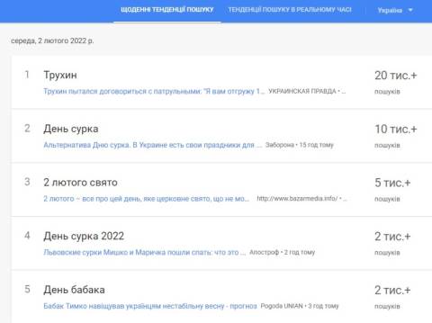 Сьогодні, 2 лютого, українці найбільше шукали у пошуковику Google інформацію про те, що вчора "Українська правда" оприлюднила розслідування з відео щодо ДТП за участі нардепа Слуги народу Олександра Трухіна, яке трапилося у серпні 2021 року.