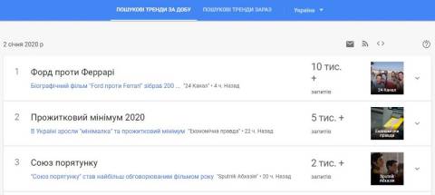 Сьогодні, 2 січня, українці найбільше шукали у пошуковику Google інформацію, що біографічний фільм "Ford проти Ferrari" зібрав 200 мільйонів доларів у світовому прокаті.