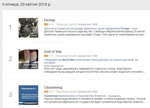 Сьогодні, 20 квітня, українці найбільше шукали у пошуковику Google інформацію про те, що депутатка Львівської міськради від «ВО «Свобода» Мар'яна Батюк привітала з днем народження Гітлера, привівши дві цитати з його книги «Моя боротьба».