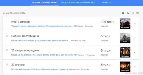 Сьогодні, 20 лютого, українці найбільше шукали у пошуковику Google інформацію про те, що у Нових Санжарах перекрили дорогу і палять шини, щоб не пустити людей із Китаю. Зазначимо за даними МВС, українців, евакуйованих з Китаю, доправлять на резервацію у медцентр Нацгвардії "Нові Санжари" у Полтавської області.