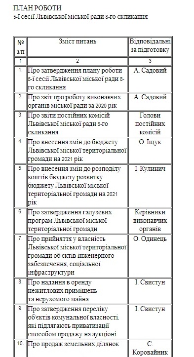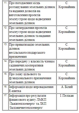 Також у порядок денний сесії включені питання щодо переліку об’єктів комунальної власності, які підлягають приватизації на аукціоні, а інформація щодо впровадження е-квитка та результати фінансового аудиту ЛМКП "Львівтеплоенерго" і ЛКП "Залізничнетеплоенерго".