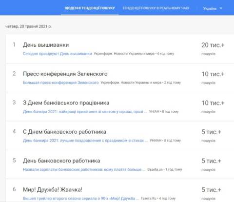 Сьогодні, 20 травня, українці найбільше шукали у пошуковику Google інформацію про те, що цього дня в Україні відзначають День вишиванки – свято, присвячене національному одягу нашої країни.