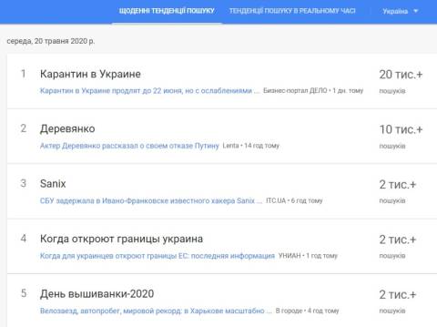 Сьогодні, 20 травня, українці найбільше шукали у пошуковику Google інформацію про те, що загальний карантин в Україні можуть продовжити до 22 червня.