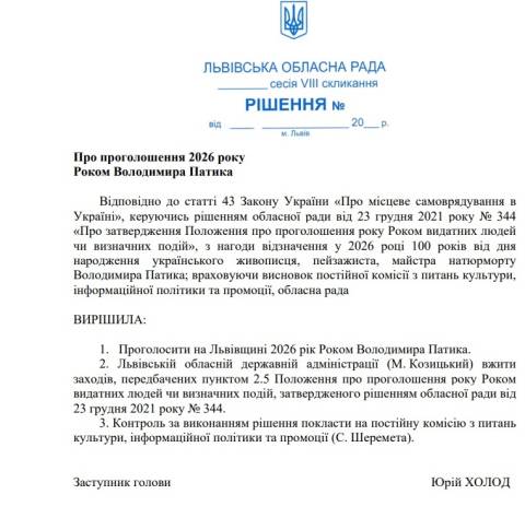 Зокрема, як йдеться у документі, облрада вирішила проголосити на Львівщині 2026 рік роком українського живописця, пейзажиста, майстра натюрморту Володимира Патика з нагоди відзначення у 2026 році 100-річчя від дня його народження.