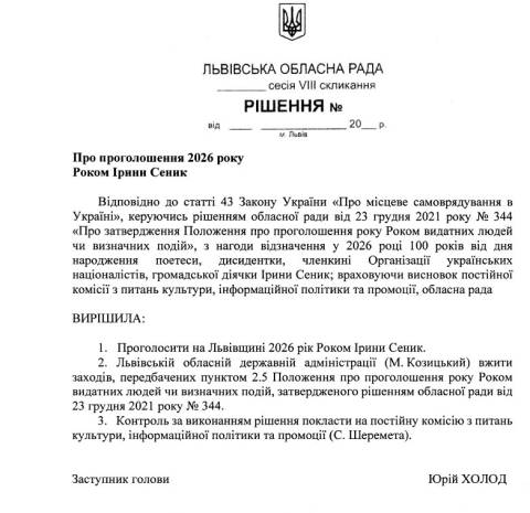 Зокрема, як йдеться у документі, облрада вирішила проголосити на Львівщині 2026 рік роком української поетеси, дисидентки, членкині ОУН Ірини Сеник з нагоди відзначення у 2026 році 100-річчя від дня її народження.