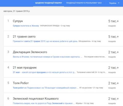 Сьогодні, 21 травня, українці найбільше шукали у пошуковику Google інформацію, що вконувач обов'язків міністра охорони здоров'я Уляна Супрун відбула з України до Женеви для участі в асамблеї Всесвітньої організації охорони здоров'я, що проходить з 20 по 28 травня. Вона повідомила, що продовжить працювати для українців.